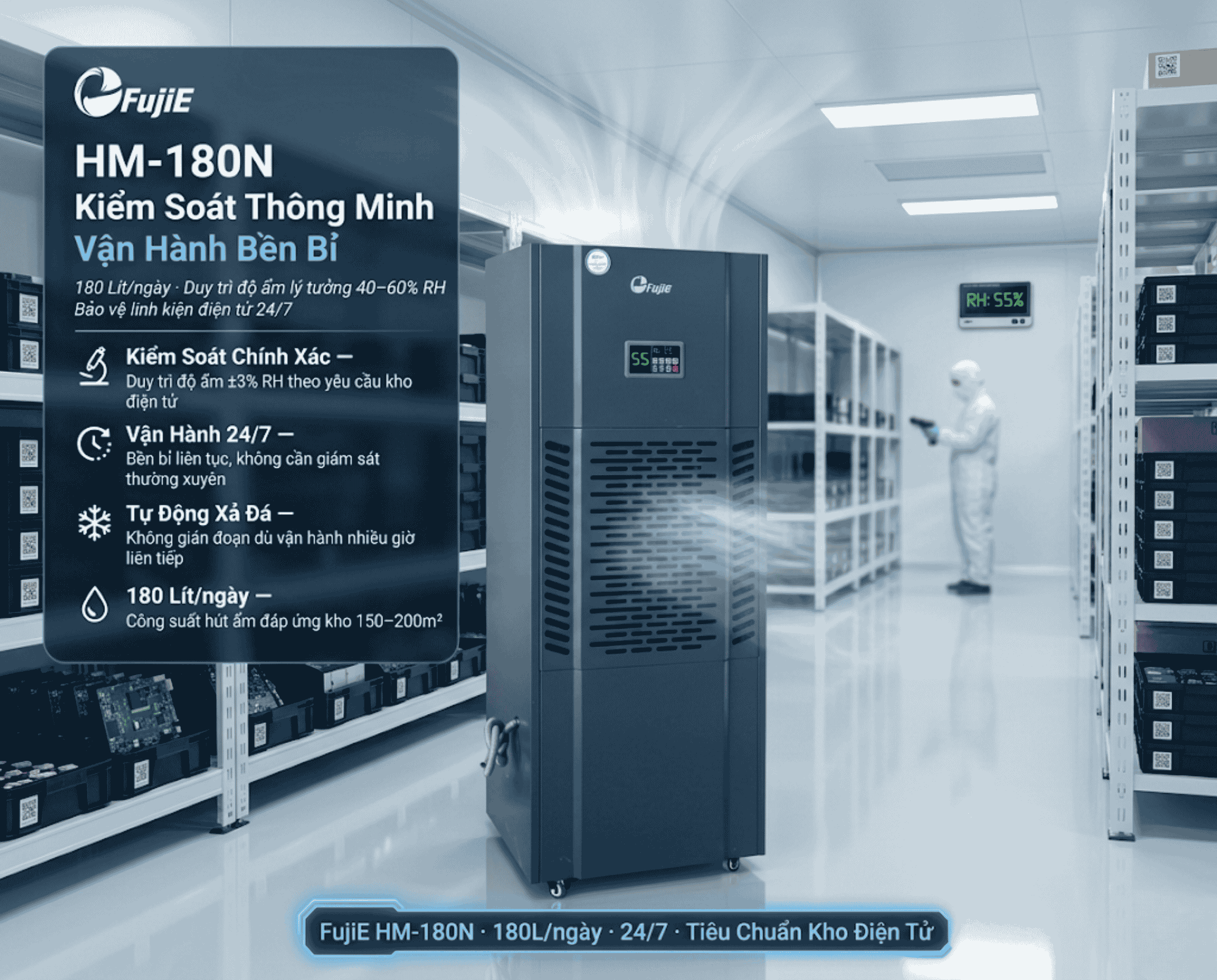 Tags: #FujiE, #HM180N, #MayHutAmThuongMai, #CommercialDehumidifier, #HEPAFilter, #CleanAir2026, #SmartBusiness, #CongNgheNhatBan, #BaoVeHangHoa